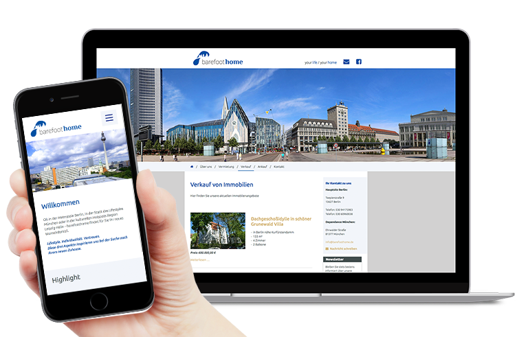 barefoothome findet für Sie Ihr neues Wunschdomizil und präsentiert sich dabei mit einer tollen Internetseite, welche auch auf allen mobilen Endgeräten eine gute Figur macht.