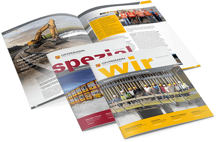 Mit den von vogeldesign erstellten Zeitschriften "Wir" und "Spezial" werden Mitarbeiter und Kunden des Unternehmens gleichermaßen über aktuelle Bauprojekte informiert.