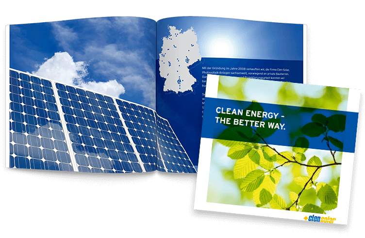 Für unseren Kunden Clen-Solar wurde eine Image-Broschüre im außergewöhnlichem quadratischen Format gestaltet.