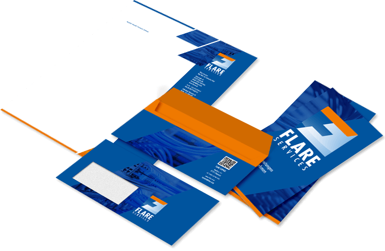 Briefpapier, Werbefolder, Umschläge – Alles was man für ein professionelles und werbewirksames Mailing benötigt wurde für unseren Kunden Flare Services von vogeldesign im einheitlichen Firmen-CI des IT-Unternehmens gestaltet.